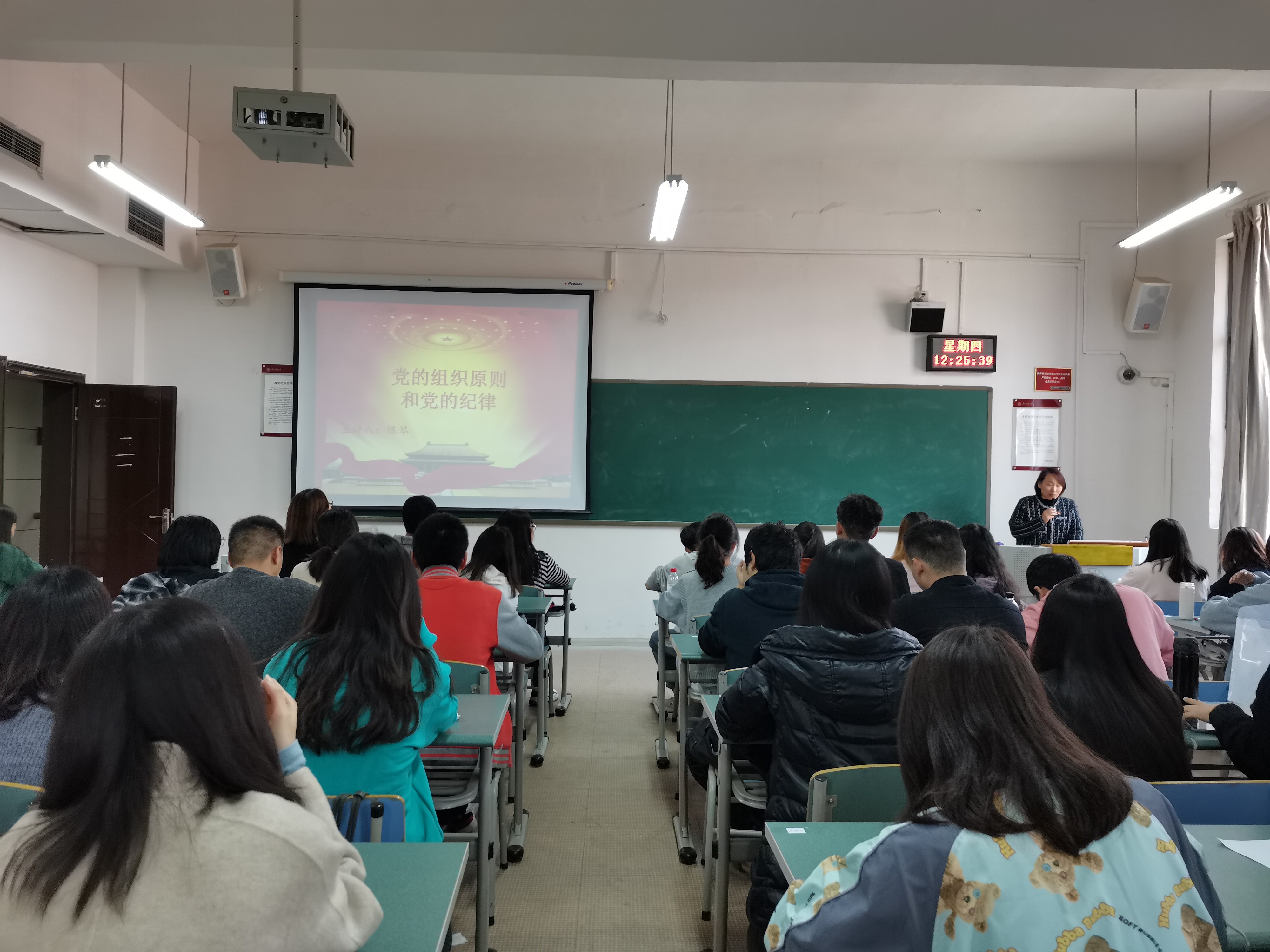 11月19日中午,信息公司党委纪检委员陈琴在志学楼414为williamhill官方网站入党积极分子培训班的学员们上党课,陈琴以“党的组织原则和党的纪律”为题作了精彩讲授。