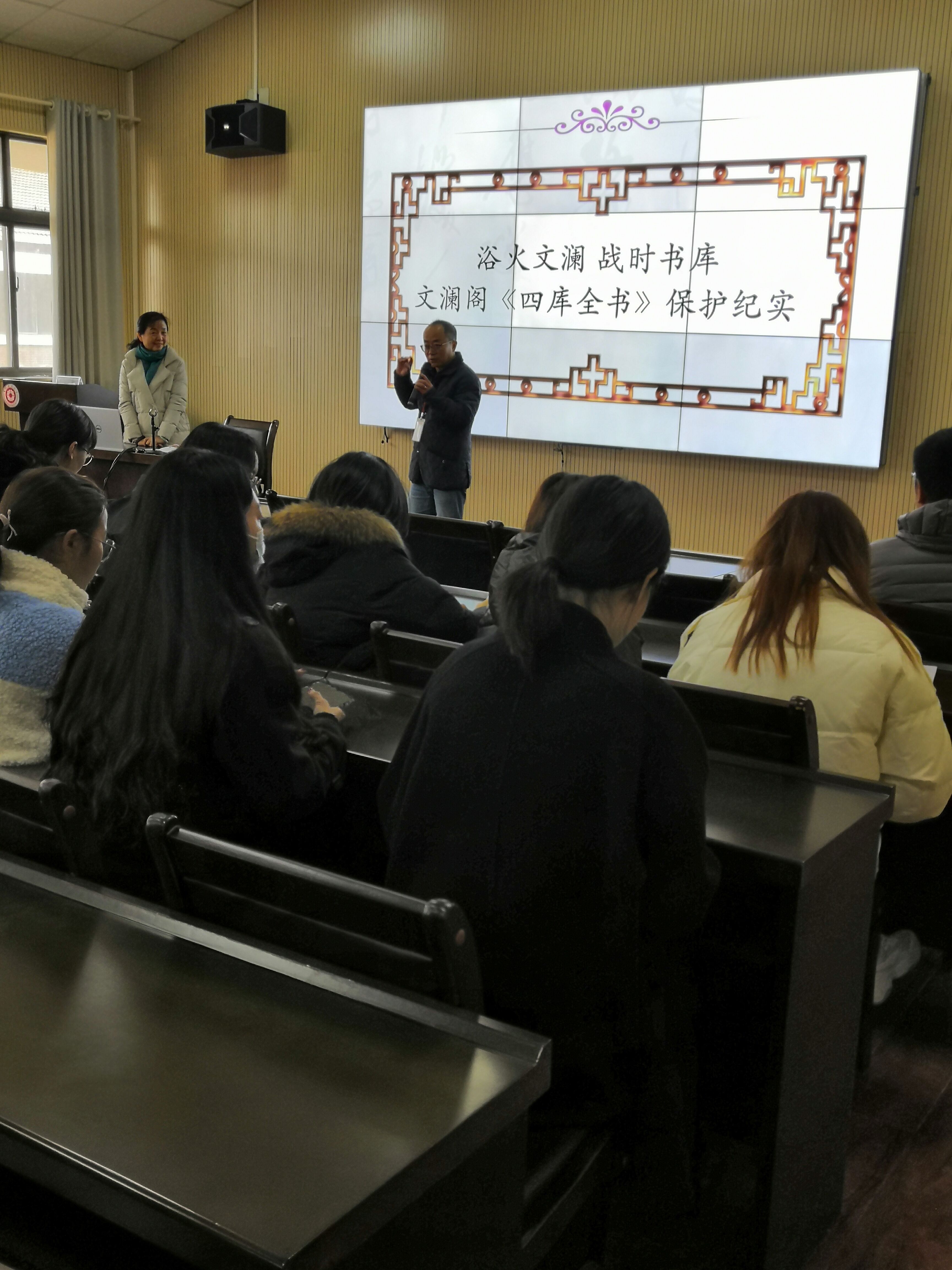 2020年11月27日下午,贵州省图书馆学会秘书长钟海珍教授在公司志学楼506报告厅作了以“浴火文澜 战时书库--《四库全书》秘藏贵阳纪实”为主题的鼎新讲堂系列讲座。讲座由williamhill官方网站图书馆馆长杨帆教授主持,图书情报硕士研究生导师杨溢副教授、崔鹏副教授和图书情报专业研究生参加了此次讲座。