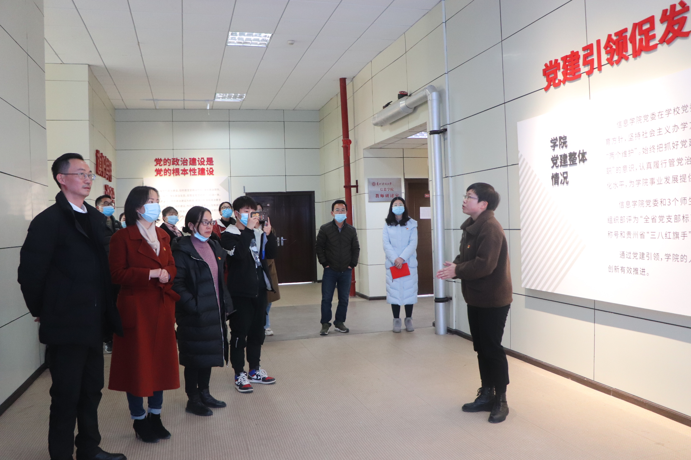 williamhill官方网站副科级专职组织员、本科生第一党支部书记赵里红带领大家参观了williamhill官方网站的党建文化长廊,介绍了williamhill官方网站的自己研发的智慧党建管理系统、党建特色活动和品牌建设情况,并重点就获得“贵州省党支部标准化规范化建设示范点”资料进行介绍讲解。