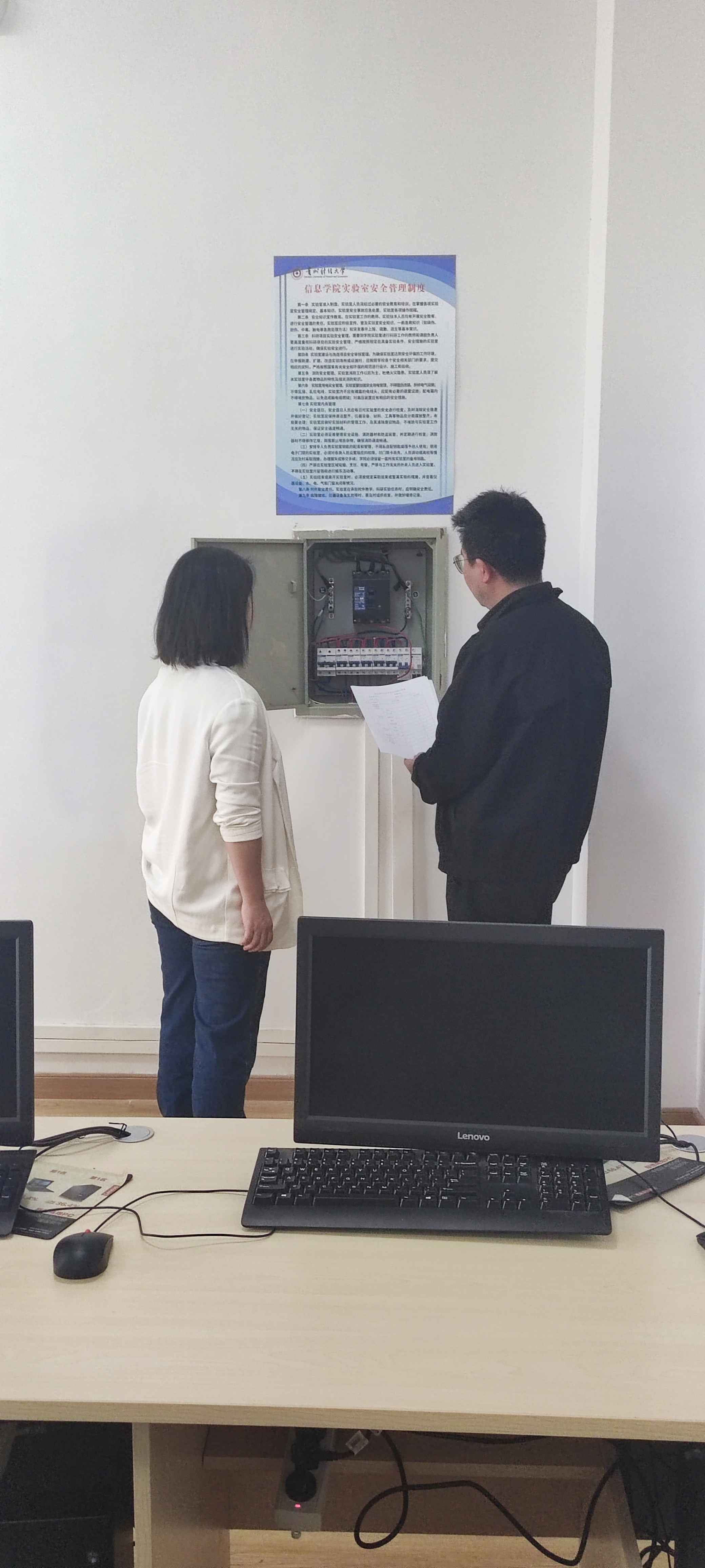 本网讯:(张骏 图文报道)3月22日下午,williamhill官方网站副经理梁敏及公司实验室负责人对公司网络实验室、硬件实验室、PLC实验室进行了安全常规检查,重点对各实验室的消防设施配备、水电管网布线等进行了排查,查找潜在安全隐患,现场商议后续整改措施。梁敏强调,要进一步加强规范管理,杜绝各风险点的安全隐患,确保实验教学正常运行。
